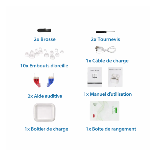 Comme pour tout élément technologique, le soin détermine son fonctionnement et sa durée. Avec un peu d’entretien simple, votre aide auditive durera longtemps. Il suffit de retirer et de nettoyer délicatement les bouchons d'oreilles avec un coton-tige pour éliminer tout cérumen, saleté ou cheveux pouvant bloquer le chemin du son. Gardez-le à l'écart de l'eau et chargez-le tous les soirs pour garantir un fonctionnement optimal.
